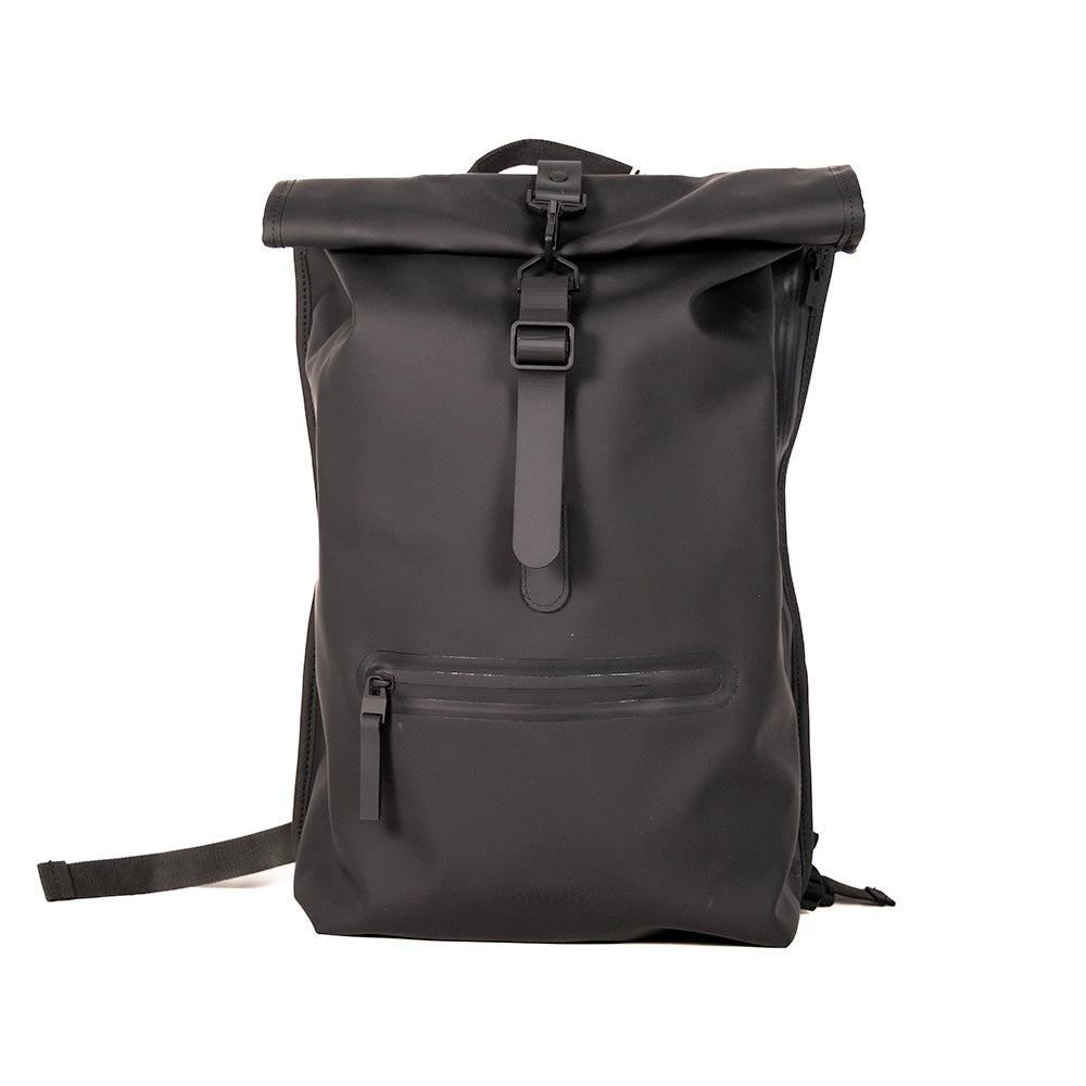 Le Rolltop Rucksack est confectionné en tissu PU emblématique et imperméable de Rains, offrant une résistance et une durabilité optimales pour un toucher ultra-doux.